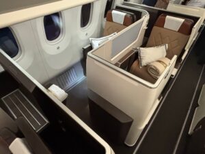 The Business Class cabin on Oman Air’s 787 features Apex Suites in a 2-2-2 configuration, but don’t let that fool you. Every seat offers direct aisle access, and if you’re lucky enough to grab a window seat, you’re in for a real treat. My seat felt like a mini-suite, cocooned in privacy thanks to high side panels and clever staggered spacing. There was an impressive amount of legroom—stretching out felt effortless—and the seat easily converted into a fully flat bed that felt genuinely sleep-worthy. Waiting at my seat was a plush blanket, soft pillow, and a mattress pad. The amenity bag was by top luxury Omani brand Amouage, and had all the usual great quality suspects. Fair enough, I had never heard of Amouage before, but the High Street price level is up there with the very best, so do not forget to take it home.